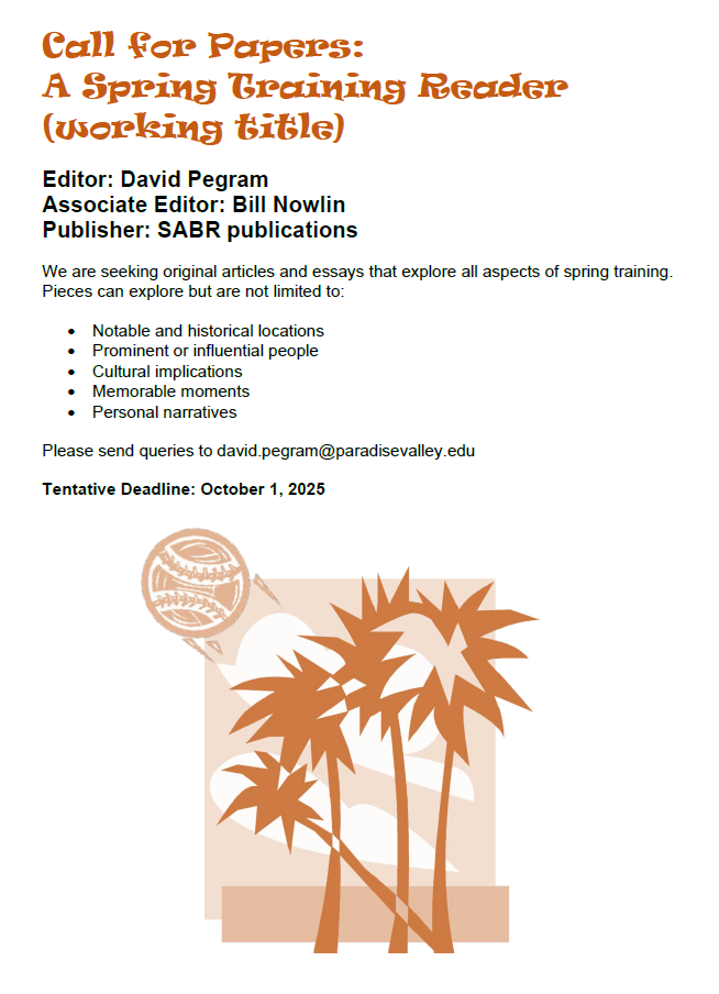 August 25, 2025 SABR is currently accepting manuscripts for a spring training anthology of essays and articles. Please see the Call for Papers below.